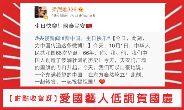 阿B喺9月閱兵嘅時候滾動到流下男兒淚,連國歌都唱唔到落去,但今日國慶就淨係post咗張「国庆快乐」嘅相加句caption「普天同慶」就算,好似求其咗少少喎~
