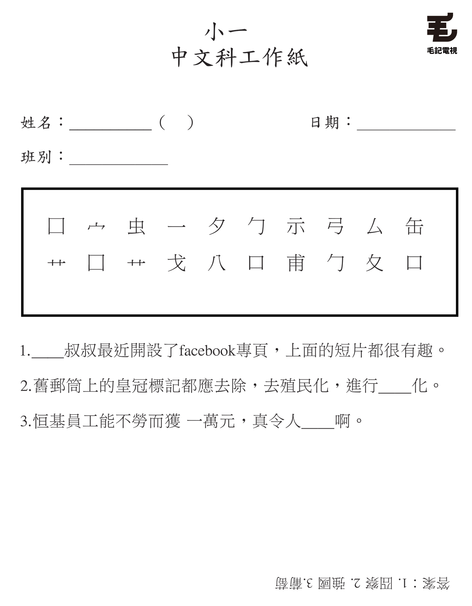呢份唔係一般嘅填充題,而係將啲畀你揀嘅生字分拆做幾組字母,要你拼返埋一齊,難度級數直迫美國太空總署面試題目嘅小一功課!呢個蠱惑的供詞填充根本供唔供都一樣,因為小朋友都係要自己諗咗個生字出嚟先會做得到嘅,sor9ly,係都未必做得到呀。