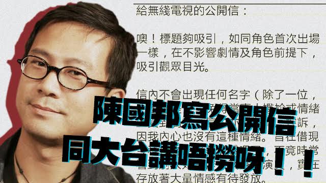連陳國邦都話唔做大台喇,陳國邦喎!結婚生仔都喺大台呢個大~家庭入面嗰個陳國邦喎,連佢都話要唔做大台呀! 雖然呢封信好溫文爾雅,冇嬲冇鬧任何人,但係都感受到佢一份無奈同埋,失望。 其實毛毛都好鍾意陳國邦㗎,尤其係《爭霸》呀《寒山潛龍》呀咁,就算小角色都畀佢做得好鬼正,不過喺大台喎,咪好似陳國邦咁講「發黑發臭」囉。希望佢之後都有好發展啦,毛毛撐你呀。