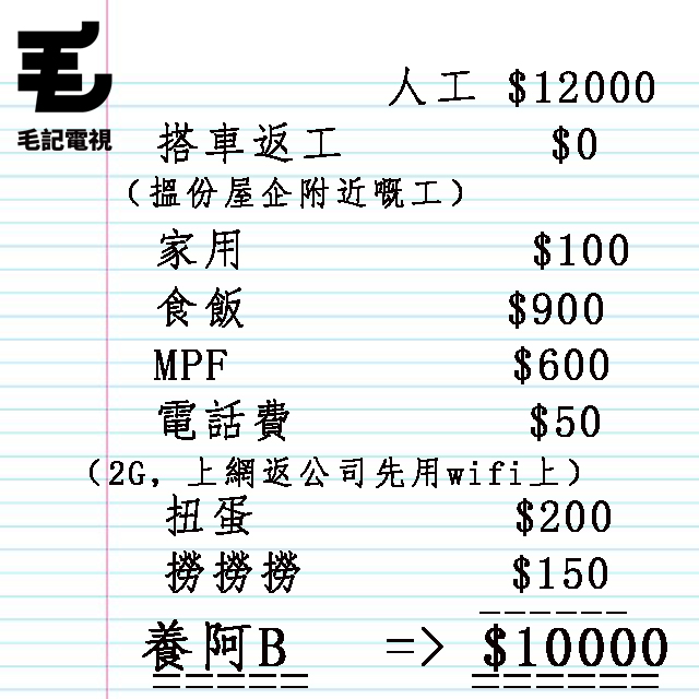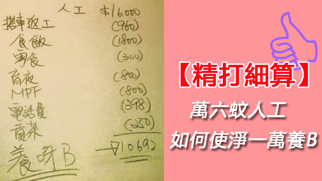 呢位巴打真係令人葡萄,佢post咗張相,話佢個讀又一城市大學嘅女朋友幫佢計過份萬六蚊嘅人工,扣埋搭車呀食飯呀、老強呀仲有零食同珍珠奶茶呢啲必要開支之後,第日都仲有一萬蚊佢哋養BB。