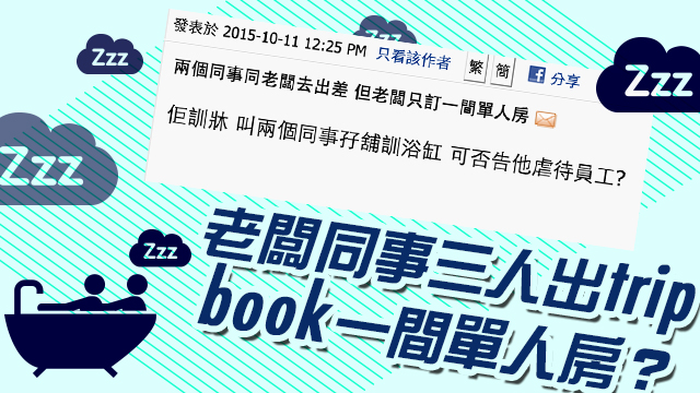 係人都知跟腦細出trip係去做嘢,唔係去嘆世界㗎啦,嗱嗱聲做完嘢咪返房瞓囉......不過竟然有網民話自己嘅同事連瞓都冇得瞓?佢話個腦細帶咗兩個同事出trip,但就淨係book咗一間單人房,腦細瞓床,兩個同事就要孖舖瞓浴缸?下,唔L係呀......