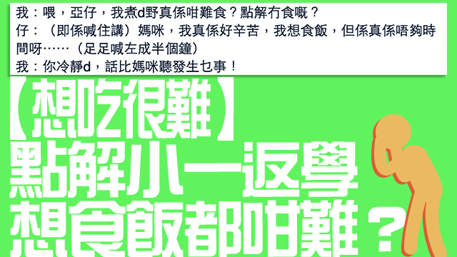 日日返工等食飯,食飯等放工⋯⋯呀sor9ry,唔記得咗真嘢唔好拎出嚟講?~係呢~你哋平時放飯有冇一粒鐘呀?最近有個阿媽話覺得自己個仔呢排放學好似冇咩精神、成隻餓鬼咁,再望下阿仔個飯盒,竟然好似冇食過咁,阿仔表示冇時間食飯喎⋯⋯典解嘅?典解嘅?典解讀小一明明有lung廚時間都冇時間食飯嘅?唔講仲以為係個阿媽整得好鬼難食呀!