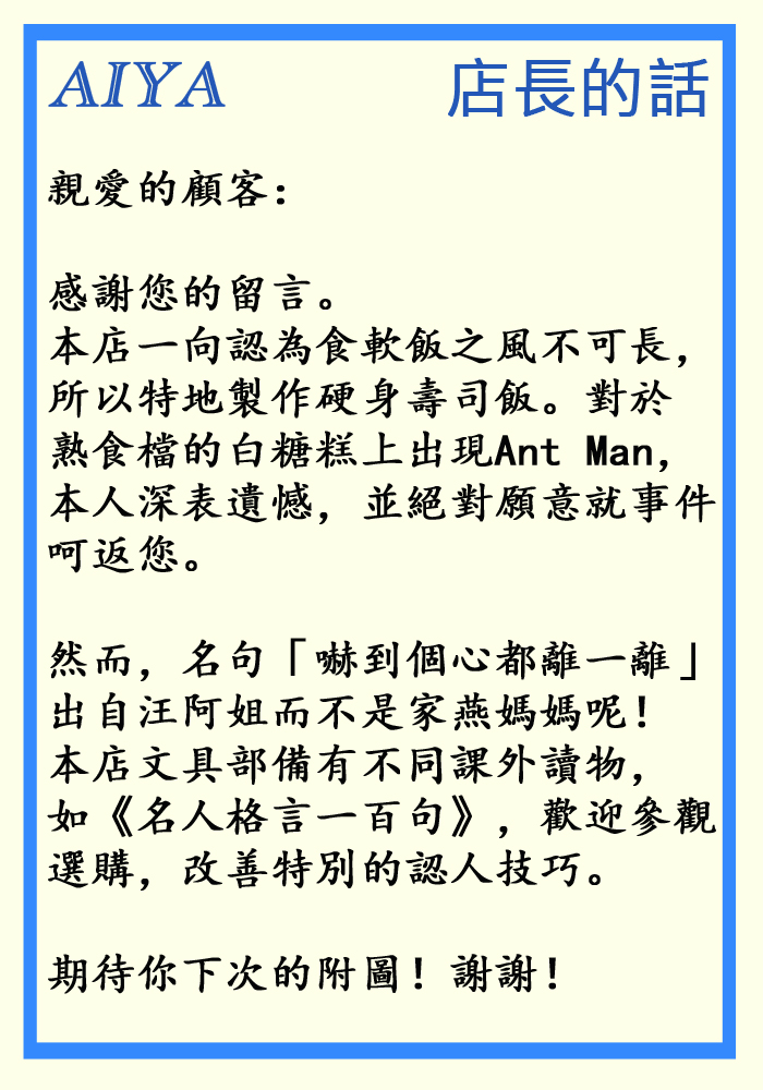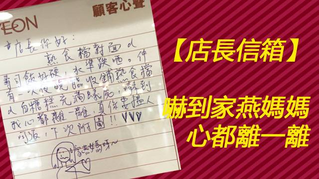 好可惜,咁有心思嘅顧客心聲,只係換嚟店長冷冷嘅回覆咋!一向又charm又warm嘅店長竟然連嚇到個心都離一離嘅係汪阿姐唔係家燕媽媽呢個咁重要嘅point都唔話返畀顧客知!分分鐘累到佢第日畀人笑㗎嘛!又要毛毛出馬幫佢寫返封warm啲嘅回信先得喇!