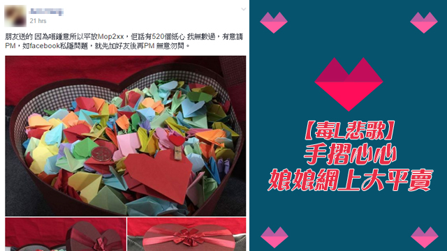 根據香港毒L互助委員會嘅研究顯示,「港女症」最近有蔓延到去澳門嘅跡象。有個澳門女仔可能好等錢使啦,惟有將佢朋友送畀佢嘅手摺心心,放上網大平賣呀!