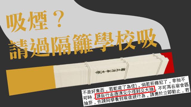喺台灣國立清華大學嘅男生宿舍,有同學投訴其他同學吸煙,搞到宿舍煙霧彌漫、好唔舒服,而學校方面聽到意見之後亦都馬上就作出回應行動,貼咗張通告出嚟,果然好聽民意呀下~張通告是咁的: