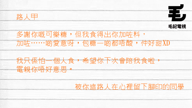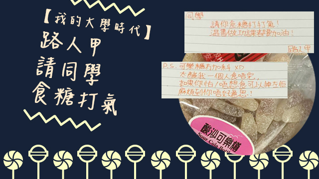 又唔一定要同同學一齊溫先開心嘅,自己溫都一樣有驚喜。有位又一城市大學嘅同學仔話佢喺拉把溫書溫到夜晚10點幾嘅時候,有個唔識嘅「路人甲」請佢食可樂糖之餘,仲寫咗張卡仔同佢打打氣呀!