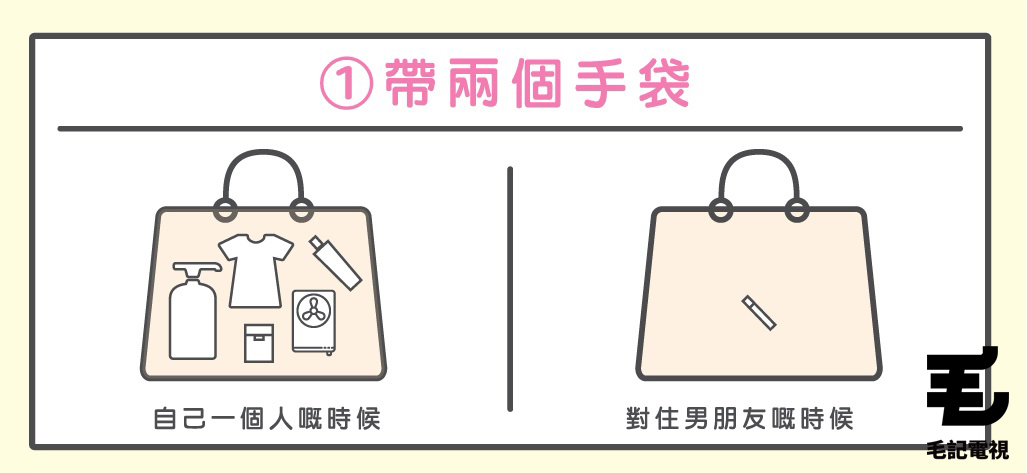 自己一個嘅時候,個袋梗係要有齊一切裝備,帶晒褸仔遮仔風扇仔,連支cream都帶埋出街,應付到任何情況;但對住男朋友就乜都唔帶,最多帶支唇膏咪夠囉~想佢借褸畀自己,落雨又遮埋我嘛~