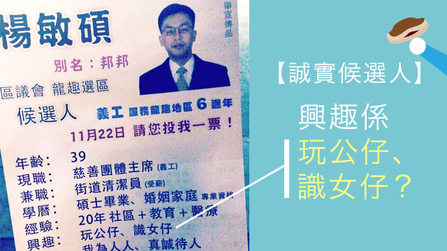 好快又到區議會選舉喇,個個候選人都出盡奶力宣傳,希望各位可以投下神聖嘅一票~而黃大仙下邨呢個候選人都有佢特別嘅宣傳技巧......就係大sell誠實!連自己嘅興趣係玩公仔同識女仔都話埋畀大家聽呀~