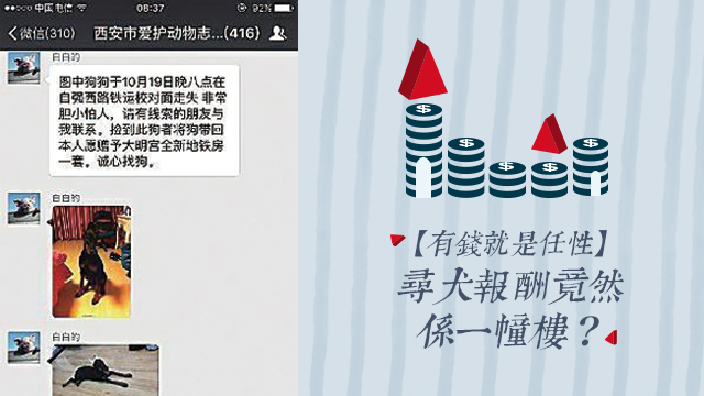 喺強國,有錢就係萬能!呢個西安壕女可能都深明呢個道理,所以喺出post嘅時候講到明話邊個幫佢搵返隻狗就有全新地鐵房一套!(毛毛都唔係好明強國嘅潮語,地鐵房9估應該就係地鐵上蓋或者係附近嘅樓盤掛。)唔好以為係騙案呀,佢連張選房卡都影埋出嚟,好有誠意㗎!