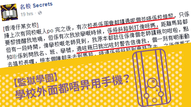 有同學仔喺名校secrets 個page度傷心些牙,話明明校長講過喺校外唔畀用手機只係用嚟提醒學生,唔係校規嚟。點知轉個頭個學生諗住喺條街度打電話畀阿媽,畀老師見到之後第二日就收到警告信喇!樂觀啲諗,其實學校都係為咗你哋安全著想啫,一路行一路用電話好容易Hi Hi㗎。送禮勤都有教啦,「馬路如虎口」吖嘛!