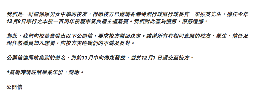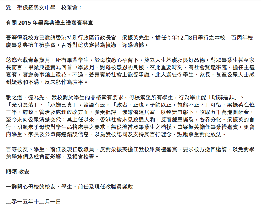 之前689做親大學嘅畢業禮主禮嘉賓都經已畀人隊晒中指,今年唔只?,佢受邀請做中學畢業禮主禮嘉賓都畀人聯署反對呀! 聖保羅男女中學今年100周年,咁高興梗係搞大佢啦,點知未出發先興奮,因為班校友知道嗰日會見到689就已經好9高興喇! 話咁快就有五百個簽名喇,係囉,689知掟就咋肚痛唔好去啦,無謂要班斯文學生哥講晒粗口做晒不文手勢吖嘛。 圖片來源/聯署link:有關 2015 年畢業典禮主禮嘉賓事宜- 公開信 封面圖片來源:蘋果日報