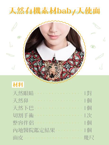 各位妹豬如果想改變面型,唔需要換個新髮型,試下呢款菜式就得。天然素材嘅部份唔需要準備,只要預留幾尺面皮做返個面底就可以。但係由於呢味係fushion菜,可能要走一轉韓國同內地,先可以令到賣相討好,同埋加強食客嘅信心。最重要嘅一環,就係你必須要搵到個整過容嘅伴侶,咁就算到時下一代嘅面容同你唔似,你都仲可以將茅頭指向佢。