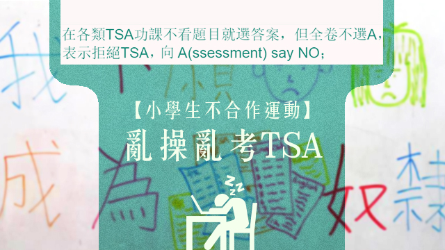 最近家長發起嘅不合作運動,就係希望家長教佢哋嘅小朋友唔睇題目就做TSA操練同試卷,令教育局傻傻分不清張卷係小朋友真心做定亂咁做,破壞數據研究嘅可靠性!竟然有家長會叫小朋友亂咁做操練,真係好大突破!不過毛毛細個冇媽咪叫都一樣亂做嘅,係咪醒先~