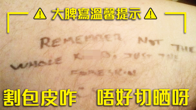 最近就有個外國伯伯去割嘅時候,竟然驚到喺大脾留字畀醫生呀:「記住唔係成條,只係嗰一塊咋,咪切錯呀!」,仲好可愛咁留個笑哈哈畀醫生?!不過佢話可惜嘅係因為自己麻醉咗,所以睇唔到個醫生見到堆字嘅反應。唔緊要喎,等毛毛幫你啦!