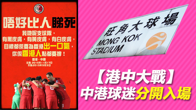 後日就係世界盃外圍賽中國對香港大戰,之前都發生過噓國歌事件啦,今次港中大戰,香港足總同康文署為咗預防兩邊球迷發生衝突,所以公佈中港球迷要分開入場,甚至廁所都要分開喎。