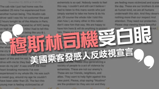 法國嗰邊一連串嘅恐怖襲擊,令到好多美國人將所有中東嘅面孔當成危險人物。有一個的士司機喊住咁同個美國人講因為佢係穆斯林,足足兩個鐘無人夠膽搭佢架車。
