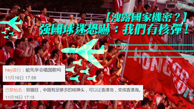 是咁的,話說香港新浪足球就喺微博出咗個post幫香港隊打氣,點知成班強國人就即刻7唔切咁衝出嚟護主喇!有條友仲激動到話要拎核彈炸香港,要將香港島炸到變香港海呀!嘩好大嘅官威呀包大人,毛毛真係巧京京,不過小心你哋啲核彈爆唔到喎,你知啦,中國咩都會爆炸,剩係炸彈唔識爆㗎嘛。