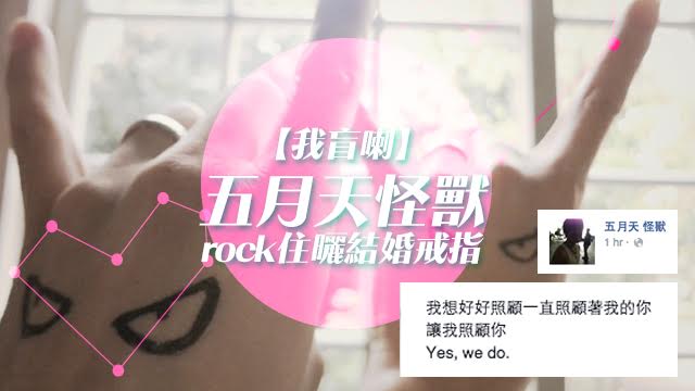 我盲喇我盲喇我我又盲喇,毛毛對眼一個月要盲咁多次我自己都覺得唔係好對得佢住呀,今日又到五月天嘅怪獸放閃喇~ 今朝台灣傳媒先傳怪獸結婚,今日下午佢就放咗張咁rock嘅閃照,真係又有型又浪漫呀! 呢排咁多人話結婚,唉睇嚟以後要放閃都要畀啲心思至得,其實毛毛有好多idea㗎喇,不過...首先......算啦都係冇嘢喇。 來源:三立新聞網、五月天 怪獸facebook
