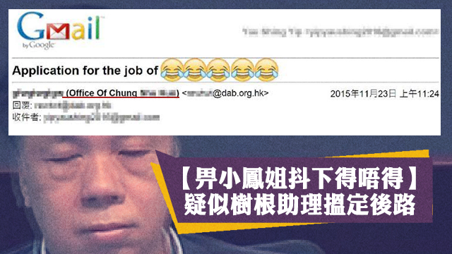 雖然又dab(禮義廉英文名)又office of Chung咁,不過真係好難估到底係邊個send出嚟囉!嗱肯肯定就唔係輸根辦公室嘅人!一定係有人同黨同姓嘅啫,一定係!話時話,後生仔做咩咁心急搵工呀?今次雖然係輸咗,但話唔定遲啲有得做焗腸......吖唔係,局長先啱!你睇下流肛華落選立法會之後即刻畀個局長佢做呀,人工仲十級跳?喎!所以計毛毛話,而家留喺treegun身邊幫佢手先有前途囉。起碼日日聽佢講成語講英文都已經學到好多嘢啦係咪先?