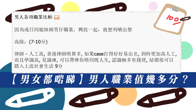 最近喺討論區有女仔將唔同職業分晒低中高級,毛毛梗係要學下嘢啦!第一級係律師、老闆CEO、機師、銀行家乜乜咁,一聽就知有米。不過估唔到大政治家輸根都有7分呀下,而導演、演員都有8分,王日日日同叻哥果然係人生贏家。