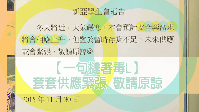 不過呢張通告唔係叫你著多件衫、小心冷親呀咁,而係話冬天嚟到,預計套套嘅需求將會上升,但因為呢部售賣機嘅套套供應唔多,所以就想提返大家未來幾日套套會供應緊張,小心搞出人命咁樣樣囉!成件事本身係好窩心嘅,但係有冇諗過一班毒L嘅感受呀?你呢張通告,真係一句撻著晒全宇宙嘅毒L呀!最尾仲要加個笑哈哈喺度,好好笑呀而家?我唔理呀,我已經預咗去掃返一打半打嚟傍身㗎喇!凍嗰陣拎嚟當手套同鞋套,既方便又快捷,吹咩(嗚嗚……)!