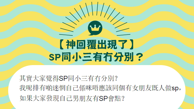 原來SP嘅定義係咁亂嘅,所以就有位同學仔問大家喇:「其實大家覺得SP同小三有冇分別?」雖然毛毛經驗值係5個0,不過都試下答你啦,SP即係唔係大婆囉,小三(btw,小咩三啫,狐狸精就狐狸精)即係唔係正印囉…… 算啦,毛毛真係唔識分,但係呢一切都唔重要,重要嘅係,神回覆出現了。