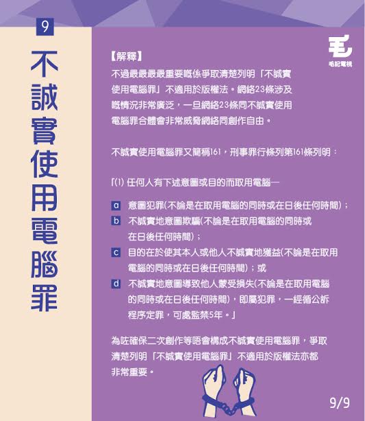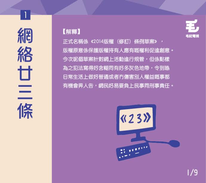 網絡23條真係好複雜,聽完都唔係幾明 ,於是毛毛搵咗鍵盤戰線嘅滑鼠娘娘做顧問,整咗9張有前文後理嘅法律字彙字典卡,懶過懶人包,睇完乜都明晒喇! 明晒喇!辛苦晒鍵盤戰線同滑鼠娘娘做法律問幫毛毛補咗成日習,娘娘話大家記得要關注網絡23條呢條惡法呀!