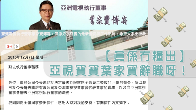 今日,係亞洲亞洲史上最灰暗嘅一日,記載住電視史上一個時代嘅結束......執笠?哦未~睇怕仲有排,係亞視寶寶葉家寶辭咗職呀! 作為一個打工仔,打工打到冇糧出不特止,仲要為咗公司而畀人倒罰返15萬,真係算仁至義盡。 雖然係咁,但係佢本身都仲未打算辭職住,只要公司今個月仲有糧出,佢都會同公司行都最後一日,好可惜,始終都因為一份出唔到嘅糧... 堅持同努力咁耐,去到今日呢個最後關頭,寶寶嘅blog始終都係得58個科勞牙,呀唔係,係終於都要辭職呀! 正所謂天下無不散之水餅,寶寶,一路好走喇,下次記住搵份有糧出嘅工呀! 圖片來源:明報、家寶博客