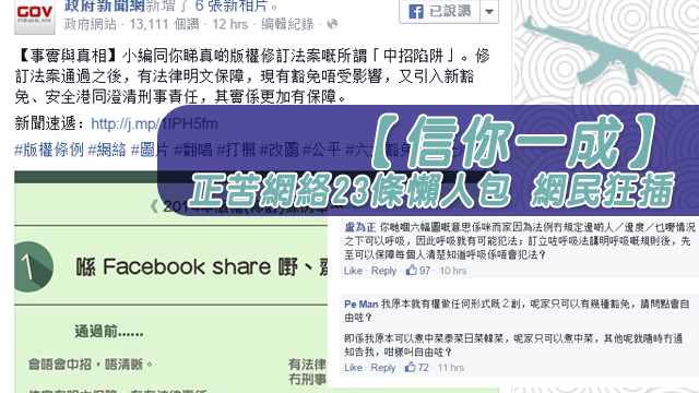 有「網絡23條」之稱嘅版權修訂條例草案聽日就會喺立法會進行二讀,好多網民為咗等大家了解多啲呢條法例,都推出咗唔同嘅懶人包,文解圖解拍埋片乜都有。而一向關心社會嘅正苦亦都喺噚晚推出咗正苦網絡23條懶人包,實行有圖有真相咁話喎。