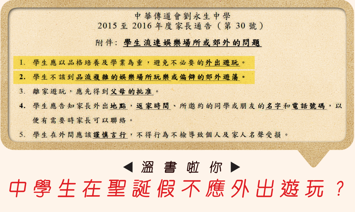 今日就畀毛毛發現,原來呢間世界級學校,連啲學生喺聖誕假有冇出街玩都會「照顧」埋㗎!佢話就算家長畀仔女出去玩,學校都會勁擔心喎,真係教者父母心喇。唔好沉迷打機或者去蒲,毛毛都明呀,但後生細仔唔好去郊野或者海灘,毛毛真係理解唔到。唔通想上大東山影下芒草都會識到壞人嘅?