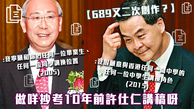 不過呢,若要人不知,唔好太低B呀,有磨擦力極強嘅網民發現,689呢句金句,同許仕仁10年前講嘅嘢係99% 相似㗎!當年許仕仁都話過自己「寧願同你們任何一位畢業生、任何一位同學調換位置」㗎~不過689又唔係直抄嘅,抄考下啫!更何況佢係公眾人物,唔通報道緊時事又要話你知咩。