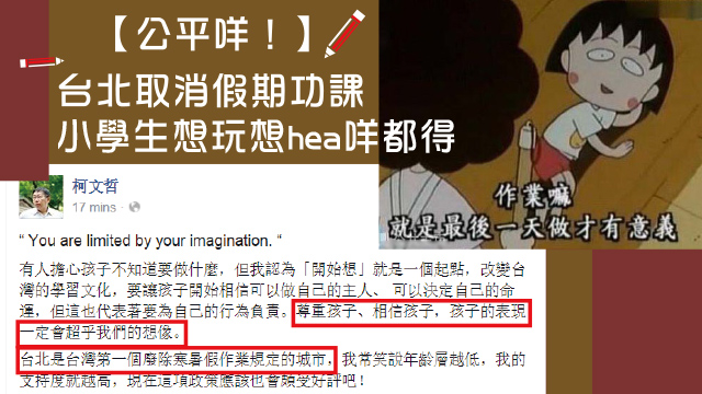 老老竇竇,毛毛細個讀書嗰陣已經覺得嗰啲所謂長假期都係呃9細路!鬼咩,一放假啲老師就狂畀功課,又週記又作文,有時放完聖誕假之後仲要考試,說好的放假呢喂!不過台灣嘅細路就好幸福喇,因為噚日台北市教育局宣佈下年開始取消小學嘅暑假同寒假作業呀!