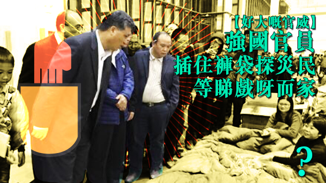 而一班災民就被安置喺附近嘅體育中心,前幾日(終於)有成班強國官員去探佢哋喇!嗯,佢哋區高臨下嘅姿態、插晒褲袋好似入場等睇戲咁;有個官員睇嚟仲做足準備,食到飽一飽,個肚漲L晒出嚟咁去探災民,真係好有愛呀!睇真啲,佢隻耳仔仲攝住支煙仔?!如果毛毛喺現場一定會即刻幫佢點著支煙啫!btw,臨時演員都係演員吖!精神啲!畀啲戲!阿爺望住㗎!