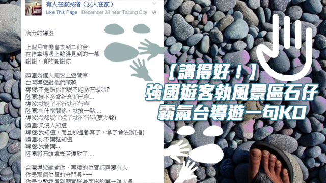 不過一向想做就做嘅強國人又點會聽你支笛吖。前排就有班強國人諗住博大霧偷偷地執幾嚿石走,仲同導遊講:「你不講誰知道!」呀咁,貫徹返一向厚面皮嘅作風。但係個台灣導遊竟然霸氣地回返佢:「我會講!」,嚇到班強國人個心離一離,嗱嗱聲放返好啲石仔呀!成個過程仲畀一個民宿老闆見到,post咗上FB同大家開心些牙!而家已經有過千個like喇!