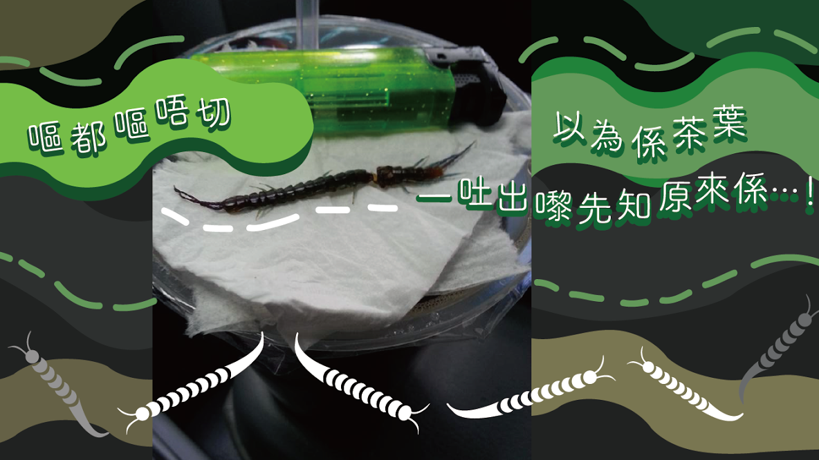 話說台灣有位網民話自己飲緊紅茶嘅時候,以為飲到茶葉,就吐出嚟啦,點知原來係成!條!蜈!蚣!嘩_!你都咪話唔驚,毛毛隔住個mon都嚇到個心離一離呀,頭先美術部妹妹都話打住冷震整圖呀!