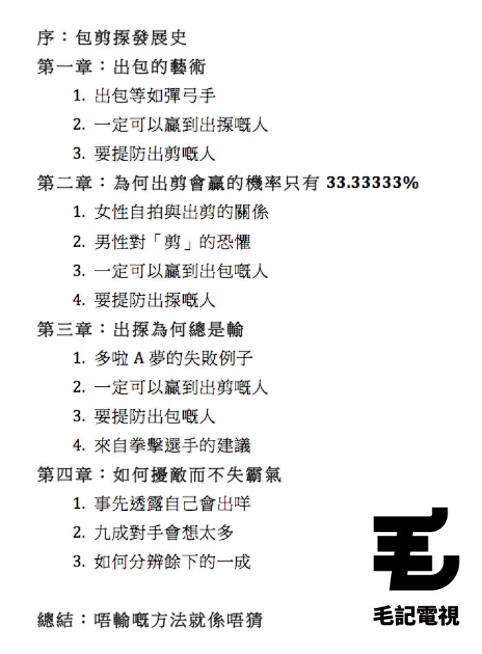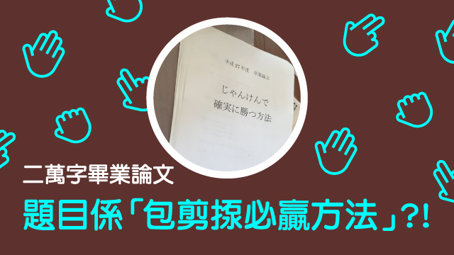 寫畢業論文最難係咩?咪就係度條題囉!而有日本網民就同大家開心些牙佢篇文嘅題目,佢個題目竟然係猜包剪揼嘅必赢方法呀!!!喂,咪睇小呢條題呀,包剪揼係高難度競技體育嚟,有埋真.國際賽㗎!所以畢業寫返篇二萬字嘅論文嚟研究下有咩必勝方法,絕對係一件好嚴肅嘅事!