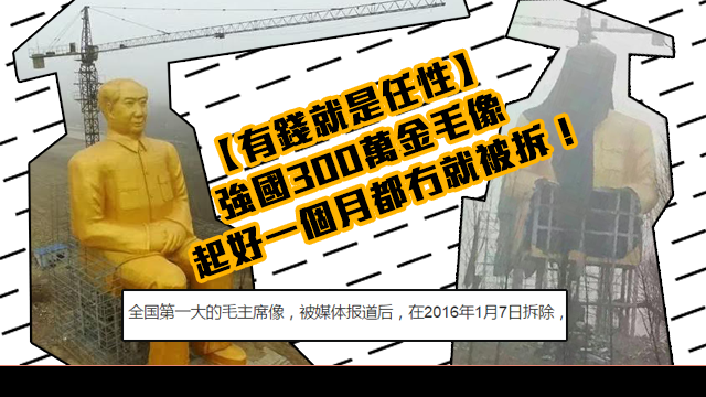 有網民喺微博度post咗張毛主席像甩皮甩骨嘅相,話原來經過傳媒廣泛報導之後,呢個金毛像已經喺噚日(即係1月7日)畀人逐忽逐忽咁拆走喇: