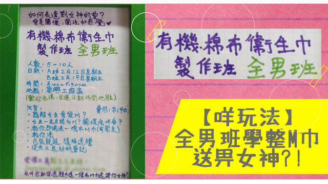 呢兩日有成10幾個讀者些牙咗呢個手作班畀毛毛,想幫毛毛追到女神,真係超滾動呀!原來係一個教男仔整棉布M巾嘅手作坊!好多網民都話覺得棉布M巾用完又用好核突,又有男仔話好似冇晒樽鹽咁,come on,其實棉布M巾喺外國流行咗好耐㗎喇~