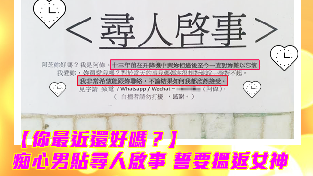 前排嘅仙氣事件,個個都係度笑個男仔煩住女神。但毛毛明呀!佢只不過係對愛情太過執著咋嘛!而最近又有一個痴心男,為咗搵返十幾年前喺?度一見鍾情嘅女神,喺自己棟大廈度貼晒尋人啟事,誓要搵返女神咁話呀!