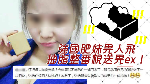 分咗手仲送禮物咁大方?係真唔係呀?原來佢係去咗抽脂,用啲肥膏嚟整番梘送畀ex……仲喺微博咁霸氣咁話:「今年既然不能陪你一起回家了,那我就用自己的脂肪做了一塊肥皂,送給你媽回去洗洗吧!春節了,送給那些以貌取人的渣男們一份禮物!」嗚嗚嗚,唔知點解,毛毛一見到就諗起豬骨拉麵個湯底呀……