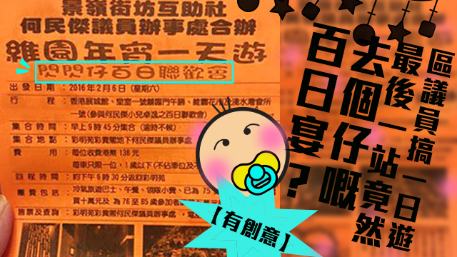 有網民就同大家開心些牙呢個一日遊傳單,開頭啲行程都算正正常常……冇咩特別!但估唔到原來亮點係放喺最後面,就係有得參加呢個區議員個仔嘅百日宴呀!成班網民見到之後都留言鬧爆,話you are not my biological son喎,冇啦啦做咩要畀錢去你個仔嘅百日宴咁樣樣呀!