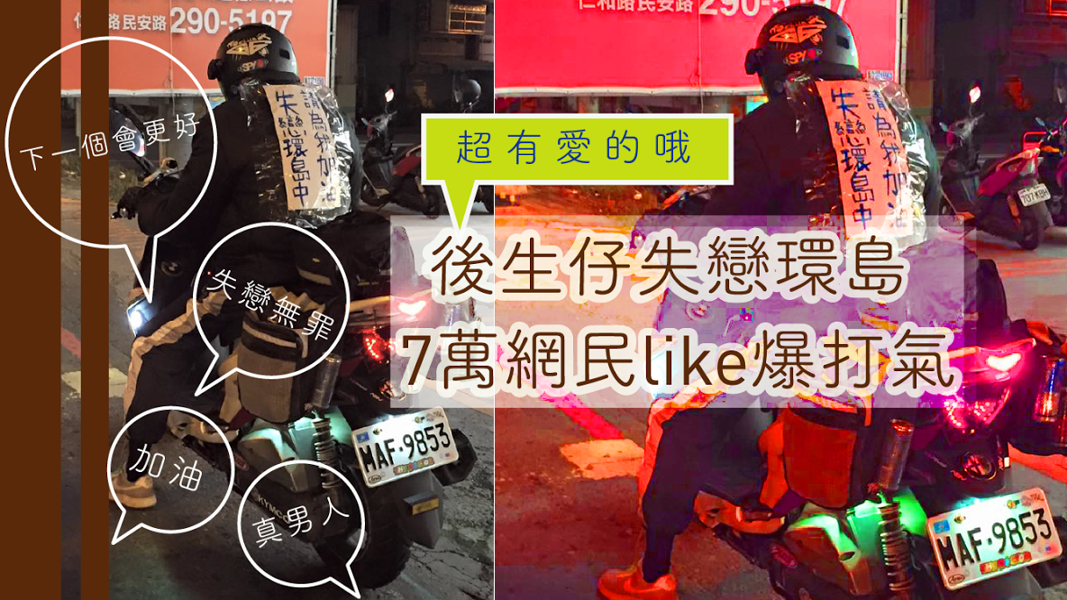 話說呢,台灣有個後生仔,佢失戀喎!然後佢就喺背脊貼住張紙寫住「失戀環島中 請為我加油」,再踩住架機車去勻全台灣。佢空虛寂寞凍嘅背影畀網民影低咗,一夜之間,有成7萬個網民畀like佢,仲有成萬個留言同佢加油打氣呀!