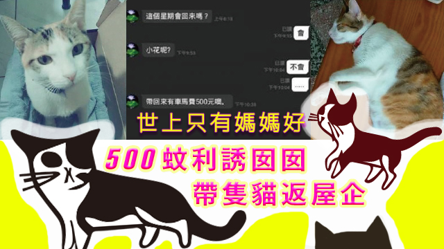 話說有位台灣網友初頭收到老母嘅短訊,以為佢掛住自己啦,點知原來佢只係掛住小花(即係隻貓),仲用500蚊車馬費利誘阿囡帶隻小花返屋企?!