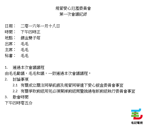 點都好啦,為咗避免呢種愛喺社會氾濫,毛毛決定動用$0.5成立一系列規管愛心氾濫嘅委員會,正視呢個問題呀!嗱,唔係講玩㗎~連會議紀錄都有呀!民生無小事嘛!