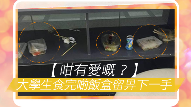有網友喺CUHK Secrets話喺伍何曼原樓嘅learning common見到呢個咁有愛嘅情景呀!你睇下,幾多食完嘅飯盒就咁擺喺張檯度,啲同學仔肯定係驚下手嚟溫書嘅同學餓親先咁做啦,除非唔係!