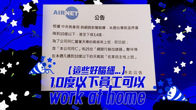 台灣人真係超有愛囉~有間台灣公司出咗通告,話今個星期如果氣溫低過10度,員工就可以work at home呀!哇,這些機會,這些好腦細......嗱毛毛冇暗示自己腦細唔夠好呀,真係冇呀……