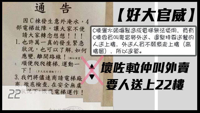 有個台灣網民就話佢楝樓壞咗?,有個住戶咪叫外賣囉~哦,壞?唔想行嚟行去,都好正常嘅~不過佢係住成22樓咁高喎!仲要係樓底高嘅,即係要人行成差唔多30層樓送個餐上去呀!