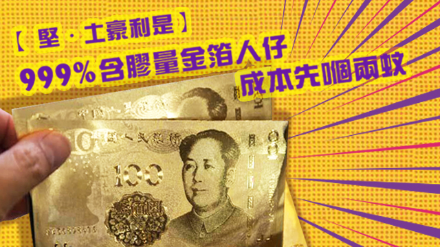 你唔好睇呢張嘢閃到咁殘眼,就以為係足金呀,少年,你真係太年輕了!佢表面上係一張金箔人仔,實際上係一張999%含膠量、膠過香港十蚊紙嘅真土豪送禮佳品!嘩,用膠都可以整到咁似金,祖國科技發展真係一日萬里!而成本先嗰兩蚊咋!用蔗渣都不如嘅價錢就整到燒鵝味道,祖國果然偉大。