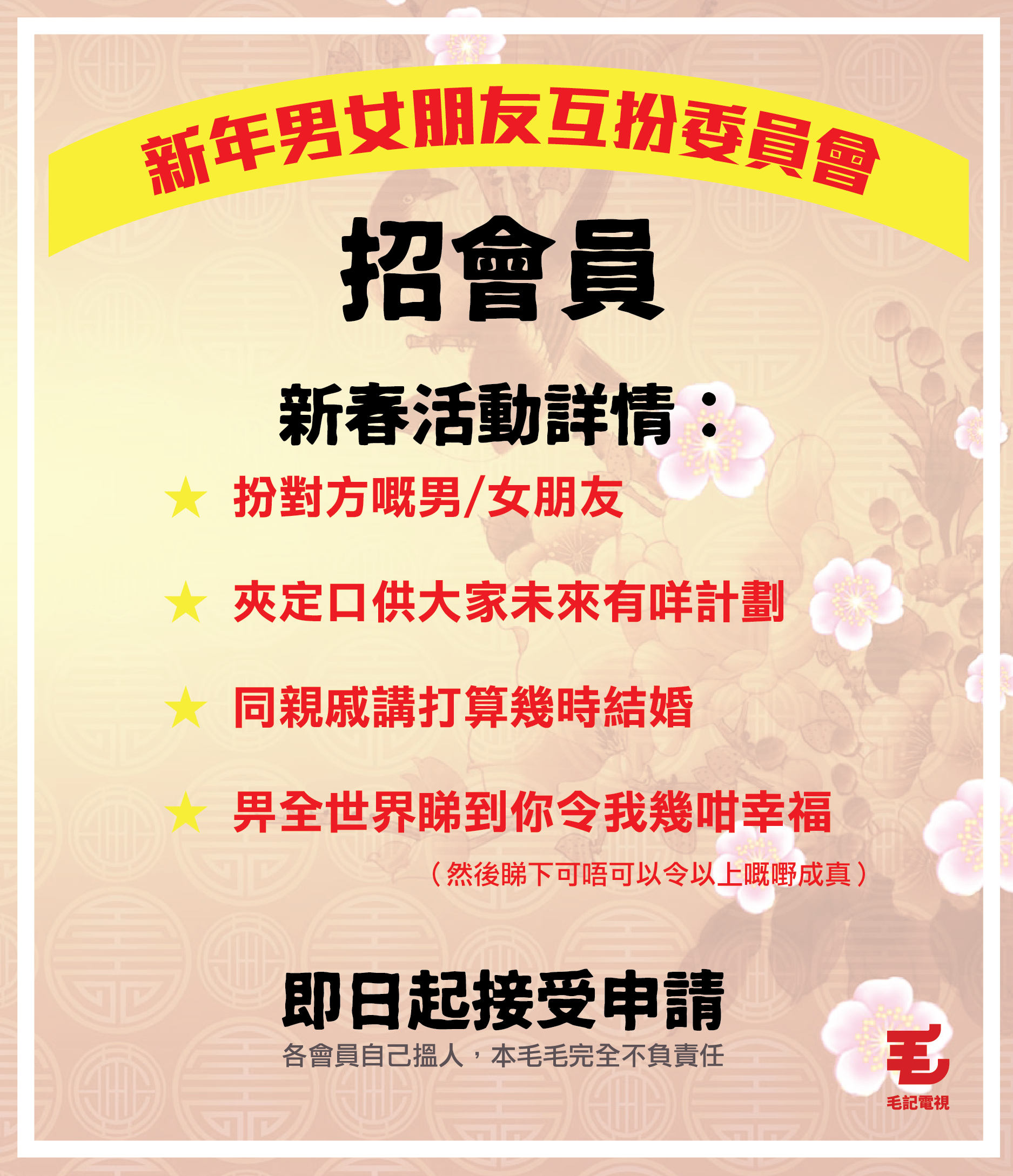 毛毛年年都會演一套賀歲片,劇情年年都一樣,都係喺啲親戚面前扮成功同扮幸福,仲一年比一年好演技?。今年仲見到有人喺搵工app度大年初一嗰日招演員扮男朋友同女朋友呀同自己做對手戲?呀。