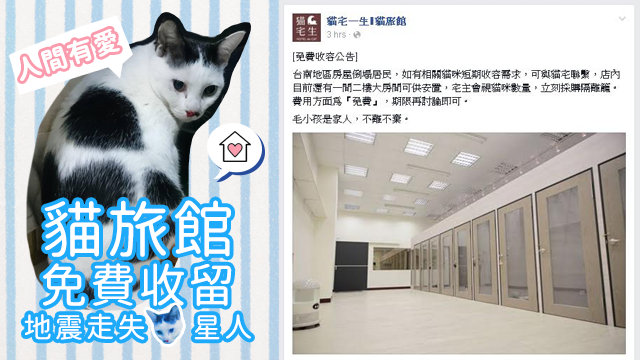 好在天災無情但人間有愛(毛毛都知好老套),台灣呢間貓旅館雖然已經一早Full咗,但依然願意吉間房出嚟,免費收留因為地震而同屋企人失散嘅喵喵呀~